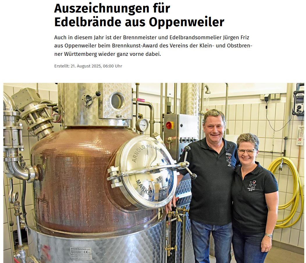 Die Backnanger Kreiszeitung veröffentlichte am 21.08.2025 einen Bericht über unsere Familienbrennerei in dritter Generation. In diesem erfahrt Ihr über unsere Tradition, Aktionen, Verkostungen, über unsere mehrfach ausgezeichneten Produkte und über unser erfolgreiches abschneiden beim Brennkunst-Award 2025.