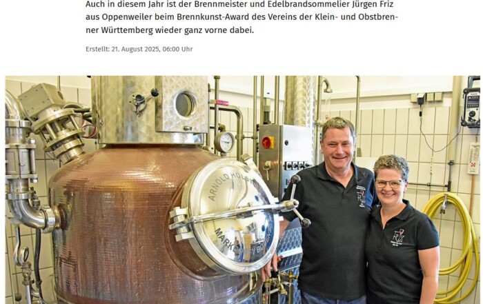Die Backnanger Kreiszeitung veröffentlichte am 21.08.2025 einen Bericht über unsere Familienbrennerei in dritter Generation. In diesem erfahrt Ihr über unsere Tradition, Aktionen, Verkostungen, über unsere mehrfach ausgezeichneten Produkte und über unser erfolgreiches abschneiden beim